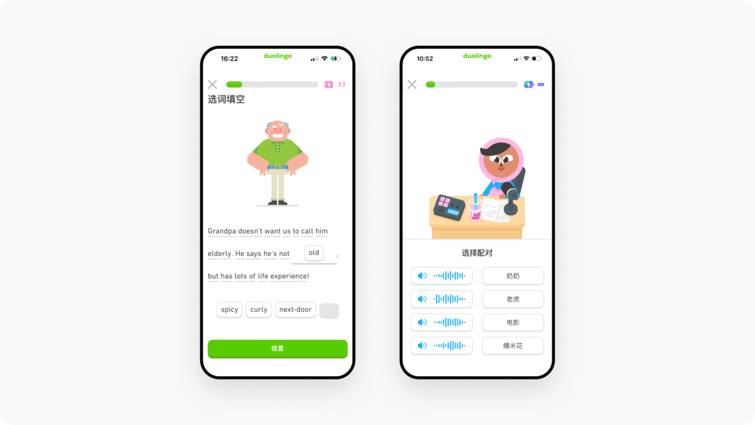 Babbel 和多邻国因截然不同的设计调性给我带来了不同的体验感受。在练习题环节,这种差异不仅体现在视觉风格上,更源于两者对「用户学习动力」的不同理解和定义。