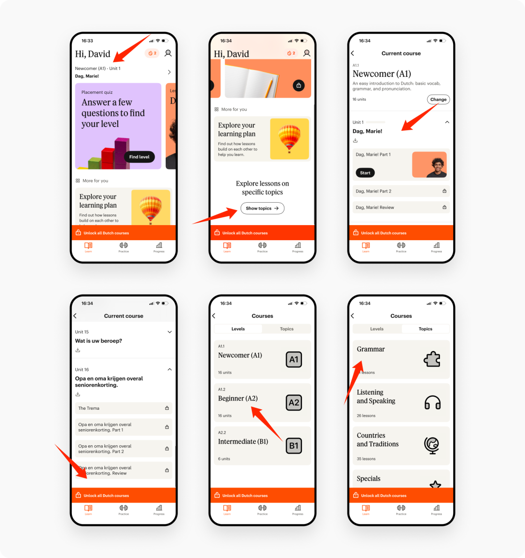 其次,结构化即效率。首页以 CEFR 分级体系为骨架,将学习路径拆解为「等级 → 单元 → 课程」的清晰层级。这种设计降低认知负荷——用户无需思考「今天学什么」,只需跟随既定路线前进。场景化的主题命名(如「Order in a bar」)进一步强化实用价值,让用户看到学习成果与现实需求的直接关联。简洁不是简单,而是将复杂性隐藏在系统背后,只向用户展示最核心的行动路径。