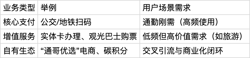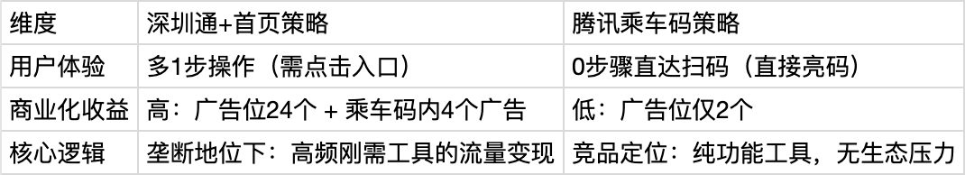 - 本质区别:腾讯是“工具型产品”(专注解决单一问题),深圳通是“平台型产品”(构建生态闭环和提升商业化收益)。