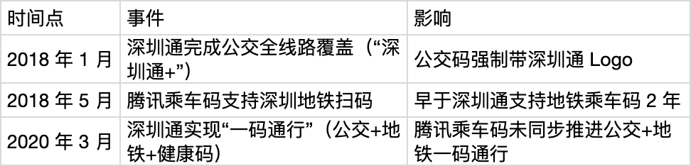 - 2020 年:深圳通实现“一码通行”(公交+地铁+健康码)后,腾讯乘车码才于同年支持深圳公交扫码(晚于深圳通乘车码 2 年)。