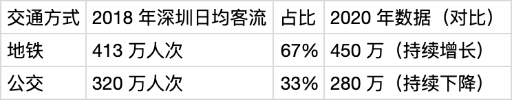 - 2018 年在深圳坐地铁的人比公交多 60 万。2024 年在深圳坐地铁的人是公交的 4 倍左右。