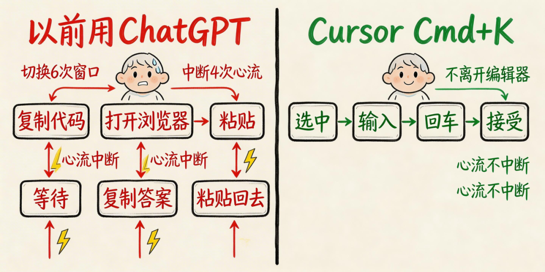 Cmd+K把这个流程压缩成:选中→输入→回车→接受。4步,不离开编辑器,心流不中断。