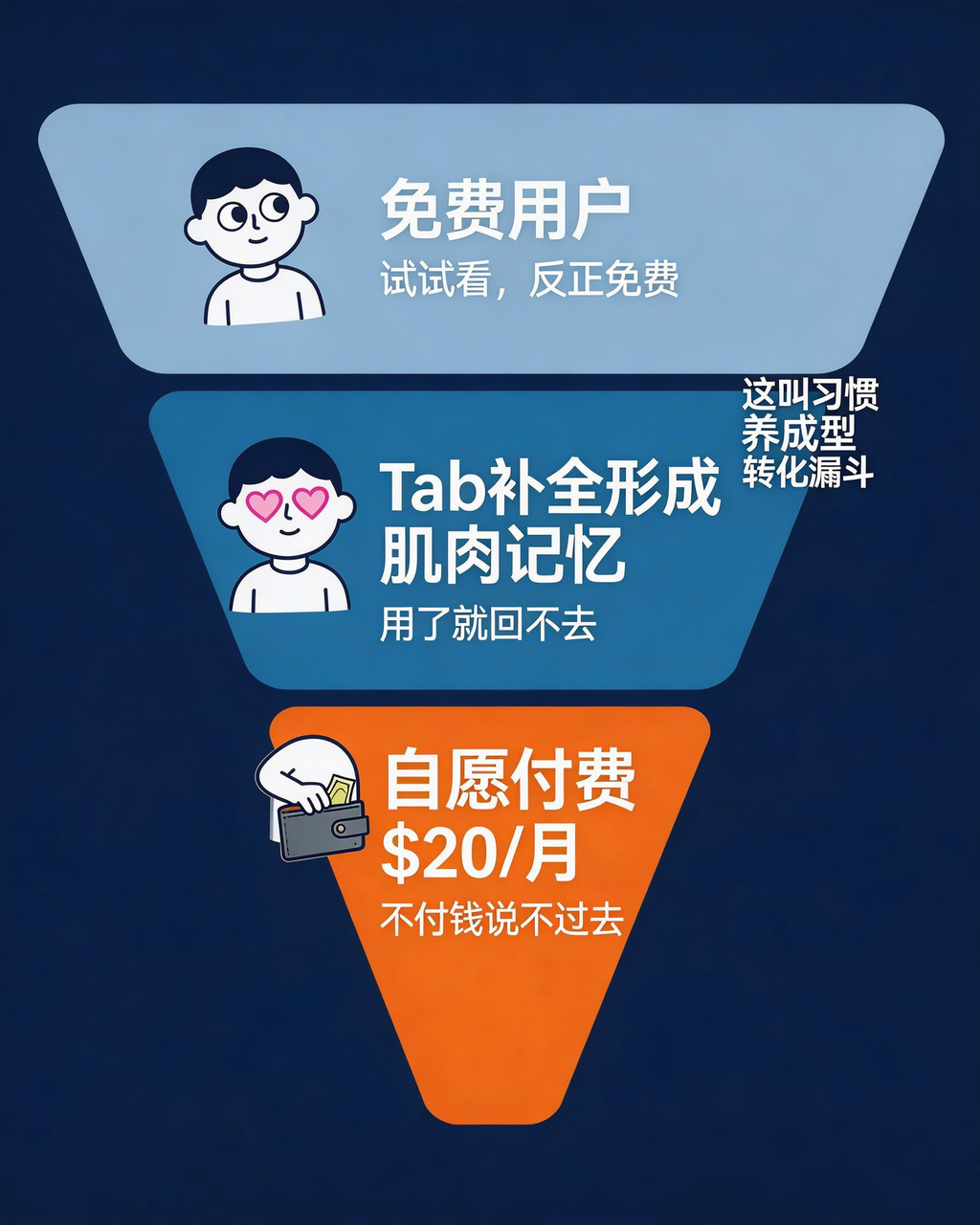 Cursor的转化逻辑不是”说服你付钱”,而是”让你先爽到,让你自己觉得不付钱说不过去”。