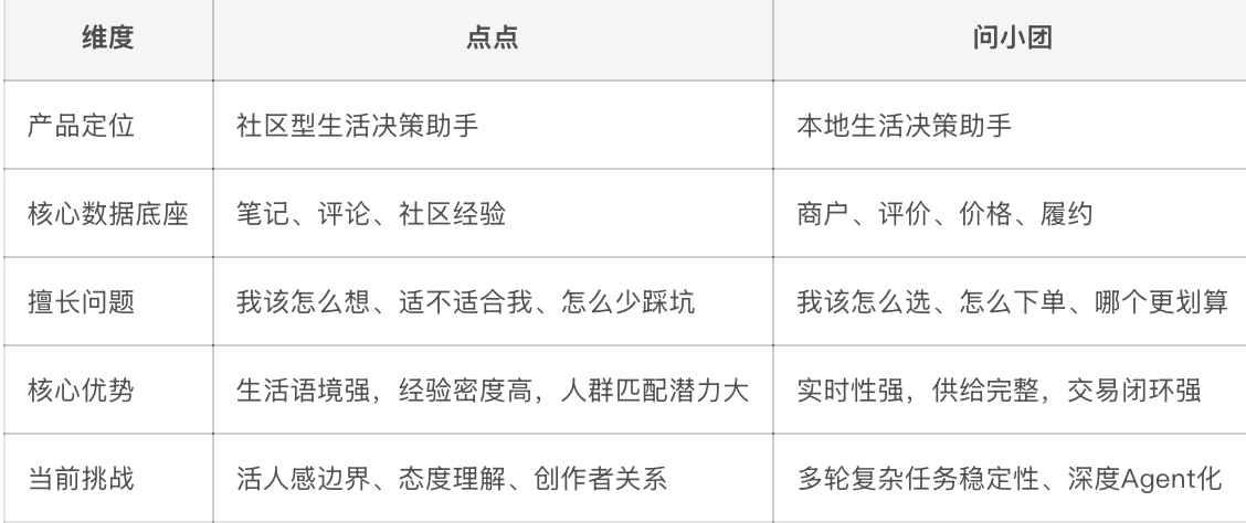 过去这段时间,很多人会把点点和美团的问小团放在一起讨论,我觉得这件事特别有价值,因为对比最能看出产品边界。