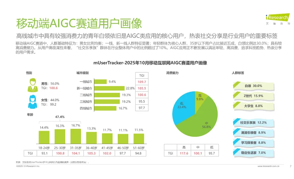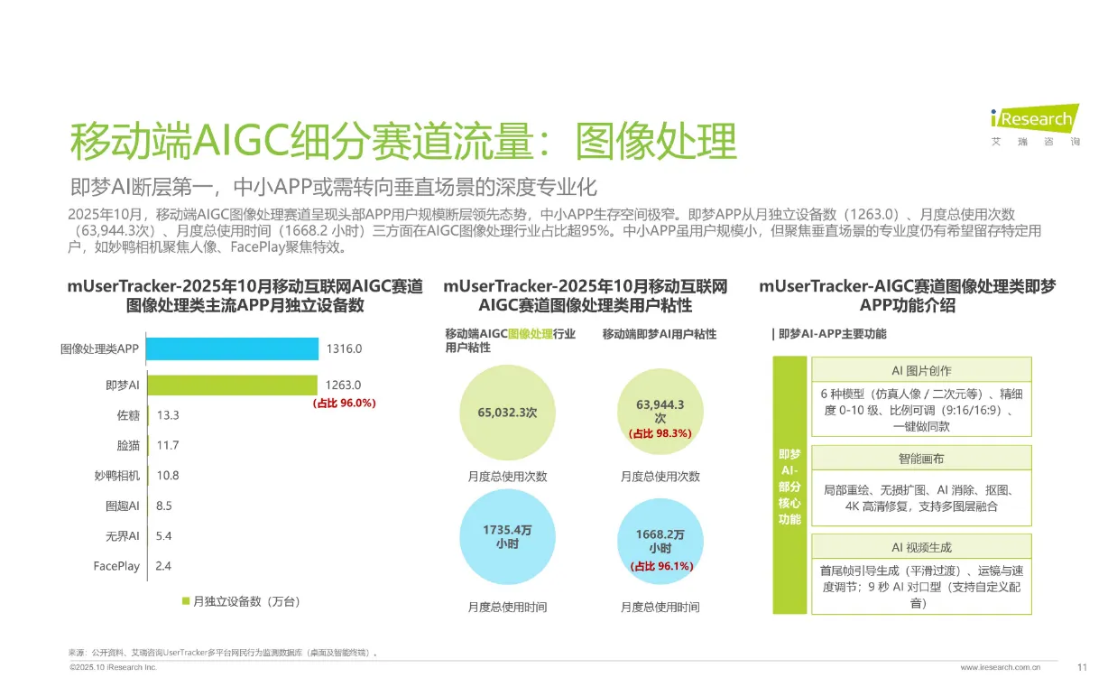 AI工具普及与挑战:2025年前10个月,AIGC赛道进入规模化应用期,用户规模达4.83亿,市场渗透率突破30%。即梦AI在图像处理领域断层式第一,月独立设备数1263.0万,占行业超95%。