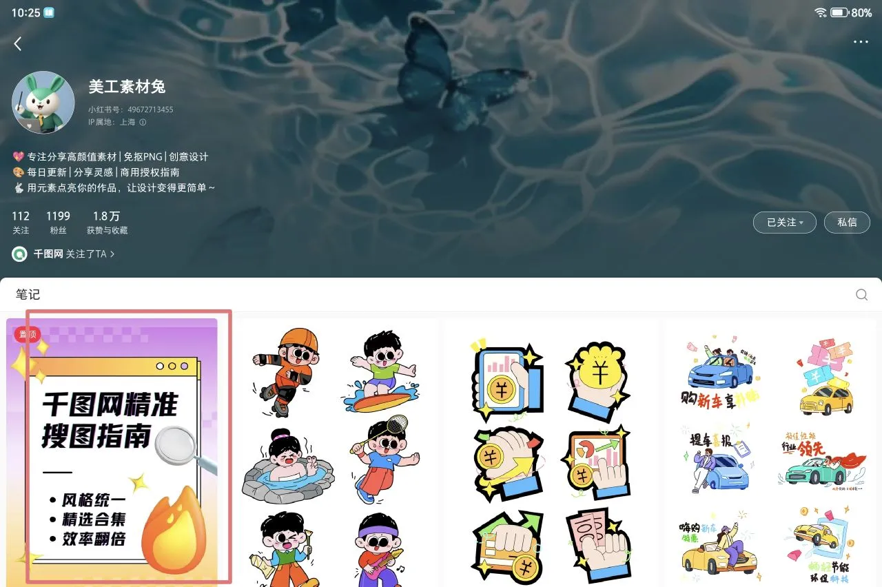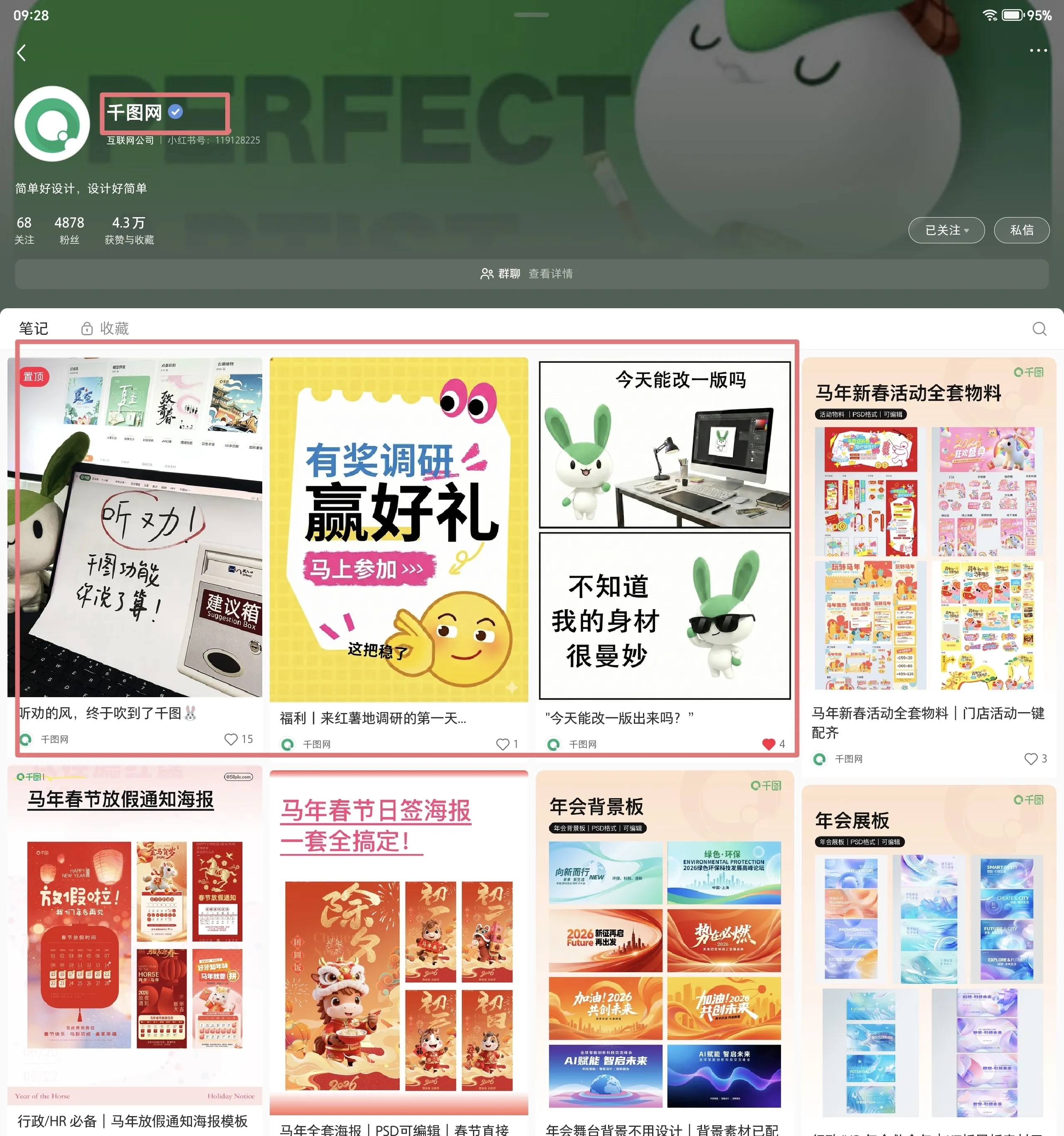 作为千图网分享官账号,置顶笔记是千图网使用指南。美工素材兔虽然和千图IP千小兔有呼应但效果不如:网站|昵称的方式。