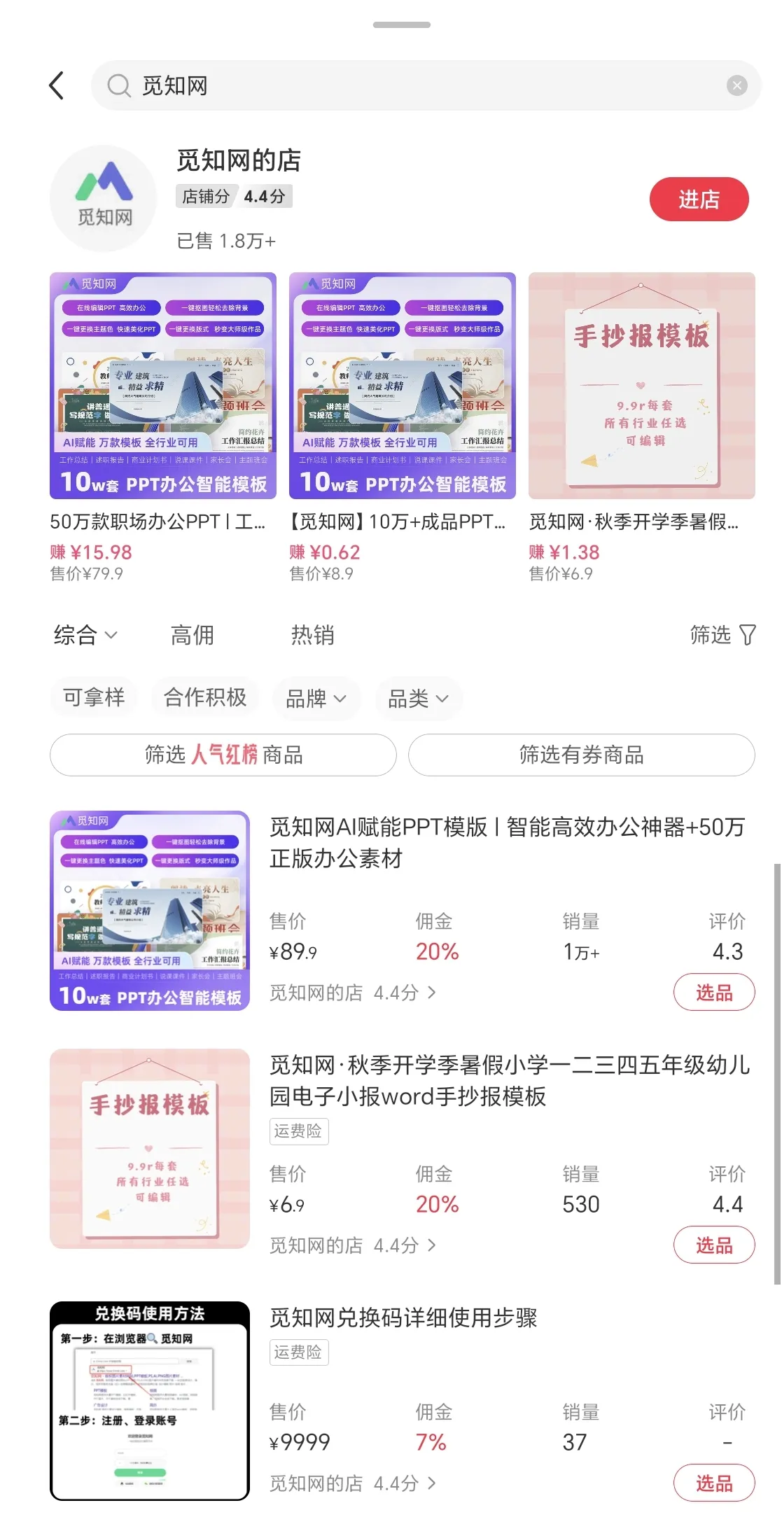 店铺数据:4.4分,已售1.8万+,佣金率20%-25%