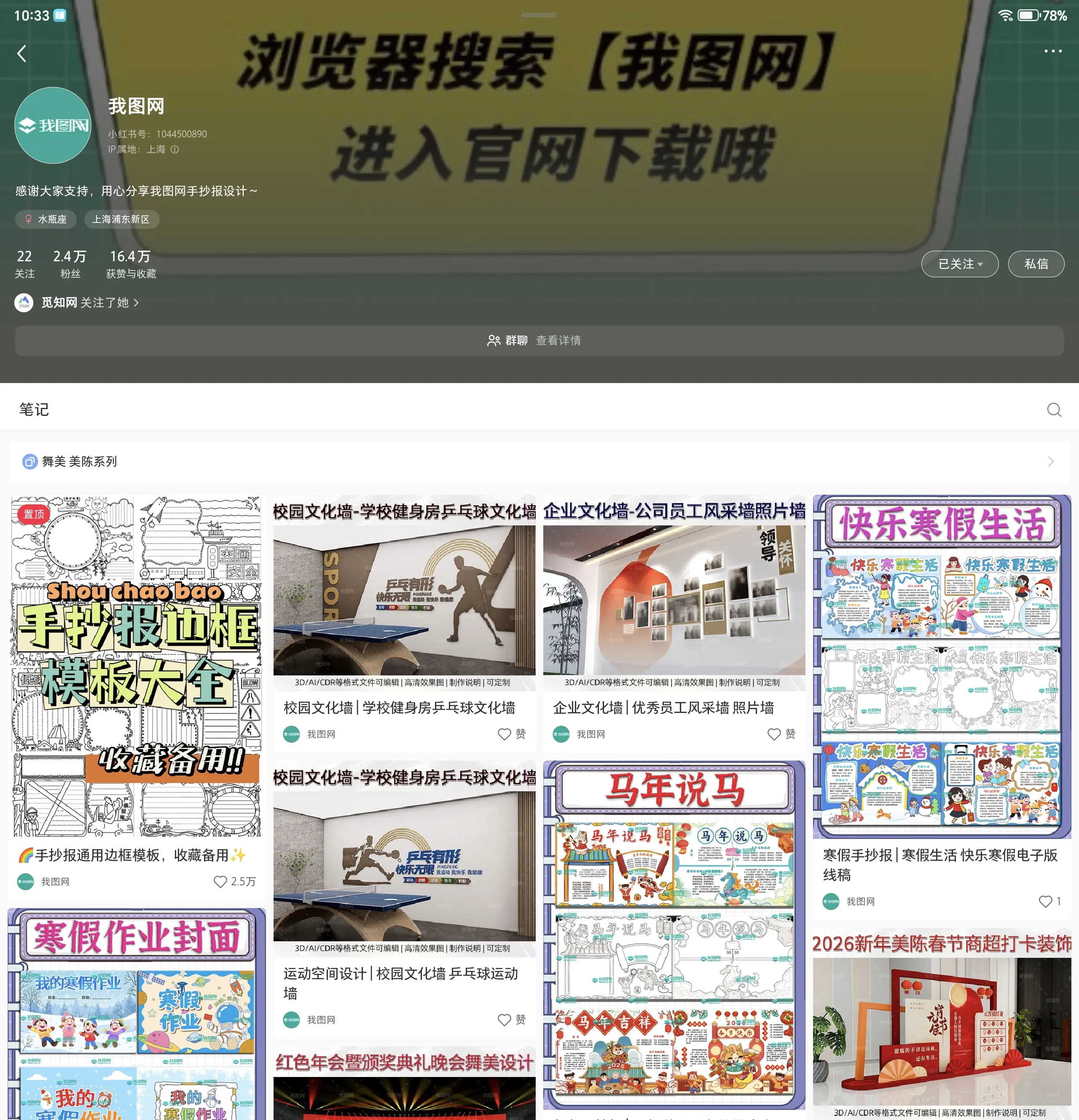 特点:素材品类丰富,小红书运营主打手抄报和企业文化墙