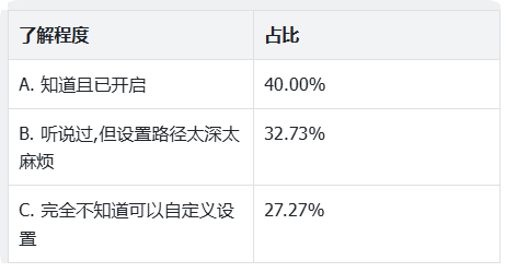 知晓度数据:72.73%的用户知道可自定义首页,但知晓不等于做到:
