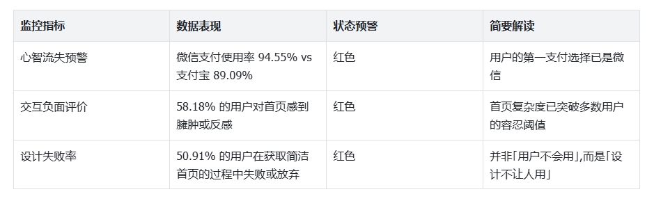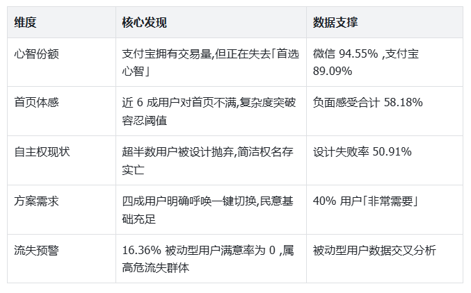 核心洞察:支付宝拥有「交易量」,但正在失去「首选心智」,主动选择的用户对首页复杂度更宽容,被动使用的用户则更挑剔。