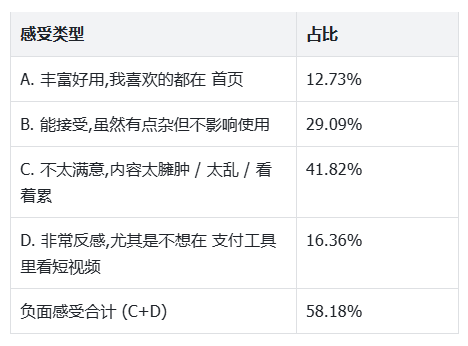 - 16.36%的用户明确反感支付宝短视频;
