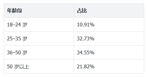 本次调研回收有效样本55 份,年龄分布覆盖各主要用户群体,无明显偏态,结论具有广泛代表性: