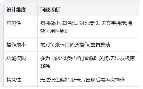 结论:根据菲茨定律,核心目标视觉权重被稀释,用户搜索时间被迫延长,操作效率 大幅下降。