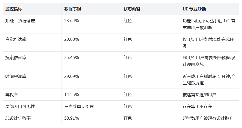 核心计算:设计失败率 (C+D+E)=50.91 % ,超半数用户被现有设计抛弃。