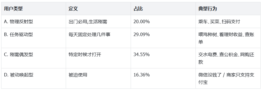 UI 视角解读:仅20%用户将支付宝视为「日常刚需」,因高频使用形成路径依赖,对功能性容忍度较高;超50%用户(C+D)为「低频任务型」或「被动型」,每次打开都是「陌生拜访」,对认知负荷最敏感;16.36%的被动型用户因「逃不掉」使用,首页混乱会持续加深其「被迫感」。