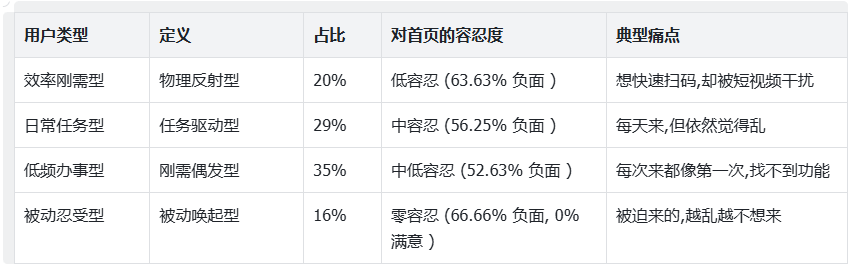 1. 分层用户画像:交叉分析不同年龄与使用动机用户对首页复杂度的容忍边界,回答「谁在忍受、谁在逃离」;