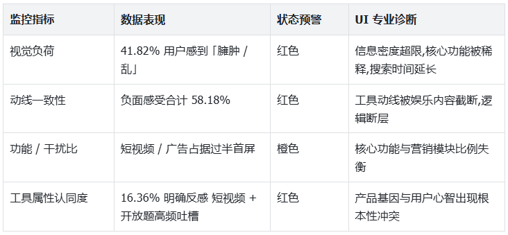 用户口中的「太乱了」可还原为三大设计失误,均指向商业效率牺牲用户效率、侵蚀 工具核心价值的本质问题: