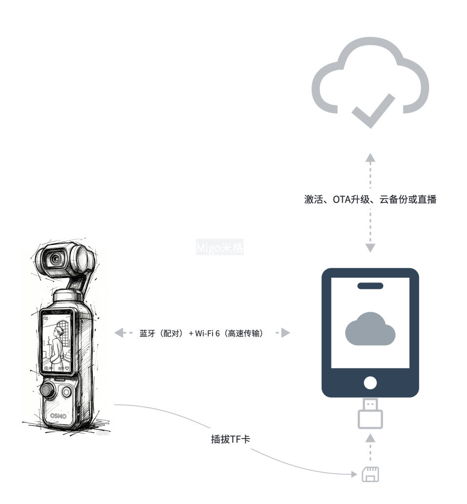 - 手机与云端(联网中转):设备激活、固件升级、云备份或直播等需要联网的操作,都由手机连接互联网完成,相机本身不直接连网,既简化了相机设计,也提升了安全性。