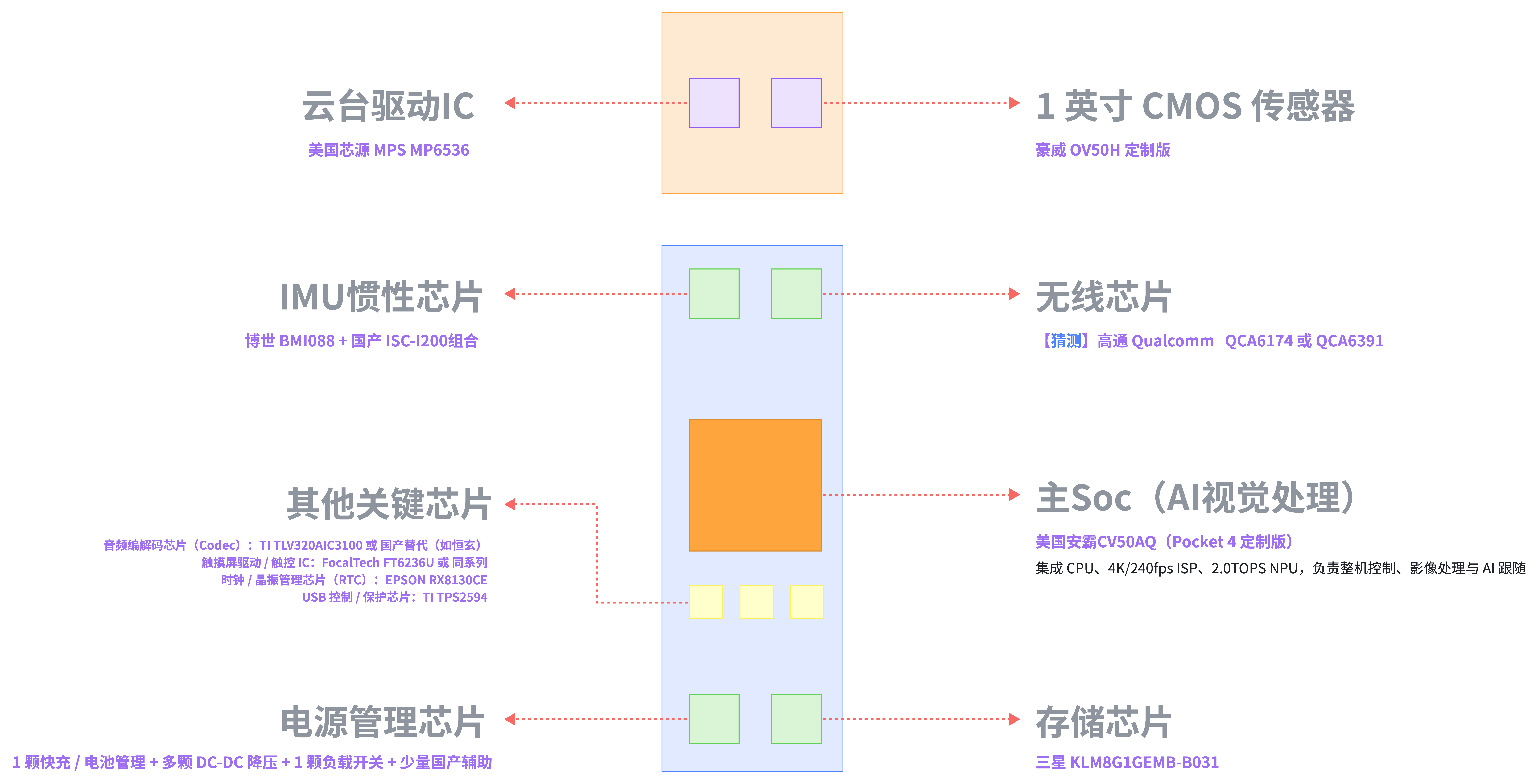 Osmo Pocket 4的核心芯片选型遵循“平衡性能、功耗、体积”原则,每款芯片对应核心功能,协同保障整机稳定:
