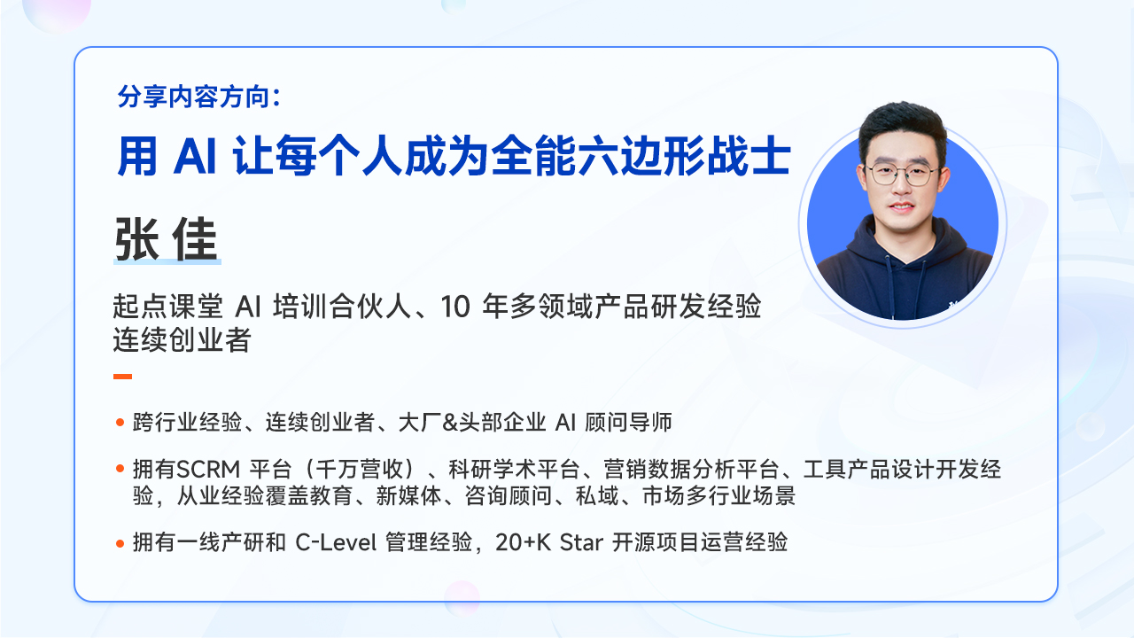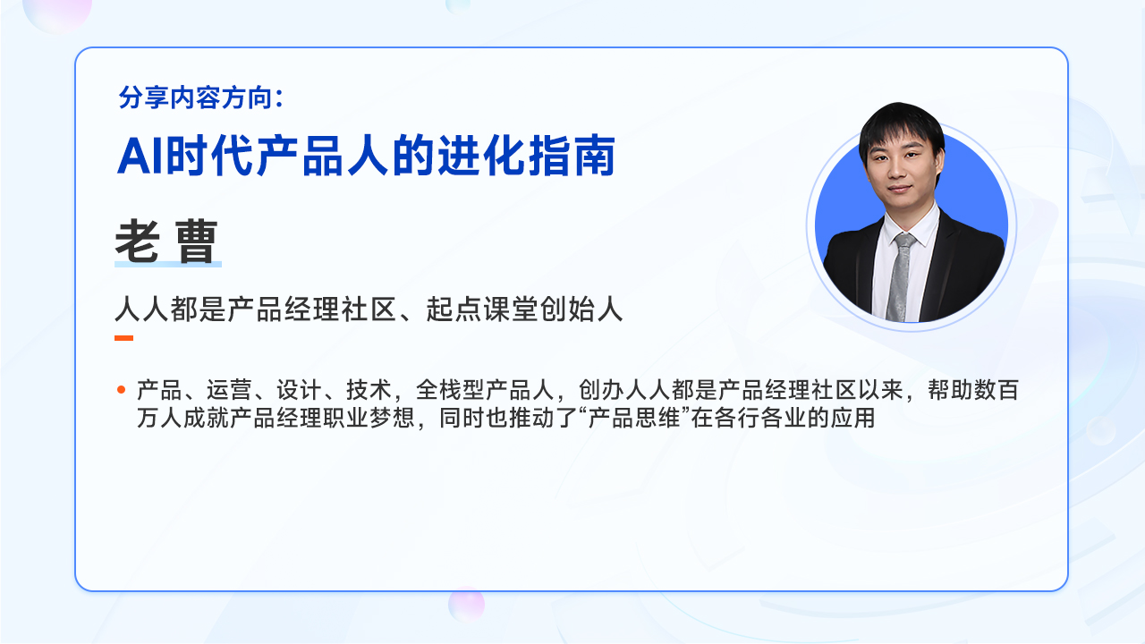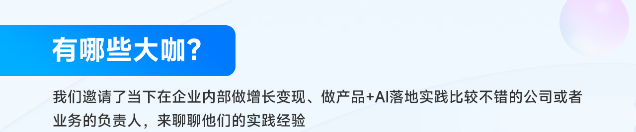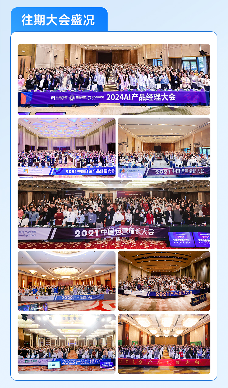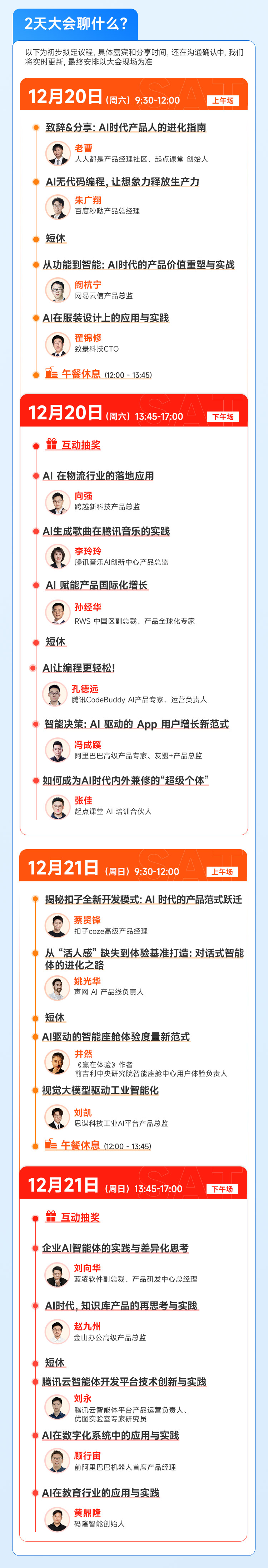 2天白天的主会场,邀请了来自大厂的专家,以及有丰富实战经验的一线产品人,聚焦在AI时代的趋势与机会洞察、AI赋能业务的落地实操来具体聊聊,有方向、有案例、有思考