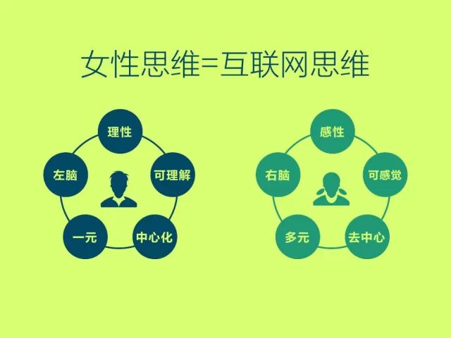 埃莱娜·西苏对男女二元特征的归纳几乎可以完美的诠释这种对立:男性特征是理性、可理解的、中心化的、一元的、左脑的;女性特征则是感性的,可感觉、体验的,去中心的,多元的,右脑——这恰恰与Web2.0时代互联网思维的特征重合。