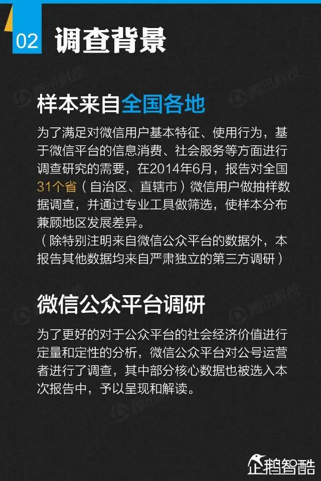 为了满足对微信用户基本特征、使用行为的了解,以及对微信在信息消费、社会服务等方面做调查研究的需要,在2014年6月,报告对全国31个省(自治区、直辖市)微信用户做抽样数据调查,并通过专业工具做筛选,使样本分布兼顾地区发展差异。