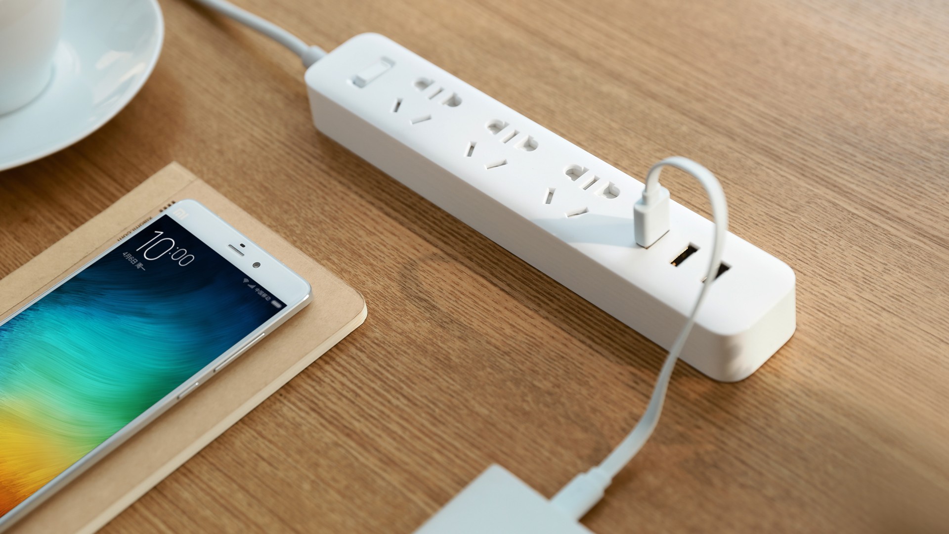 提出这个目标到今天才发布,这就是我的要求,我的目标是把插线板当艺术品来做,要让我们的生活变得更美好。提出这样的目标以后,到今天发布两年的时间,我们来看一下小米插线板,不是小米做的,是我们提出理念,由创业公司去做的。我们看一下,只有铅笔盒大小,三个标准的USB、三个国标插孔,包括保护开关,是同样功能的插板里面最小的、最薄的、最轻的。它看起来不起眼,你要是跟你家的插线板放在一起,绝对是鹤立鸡群。