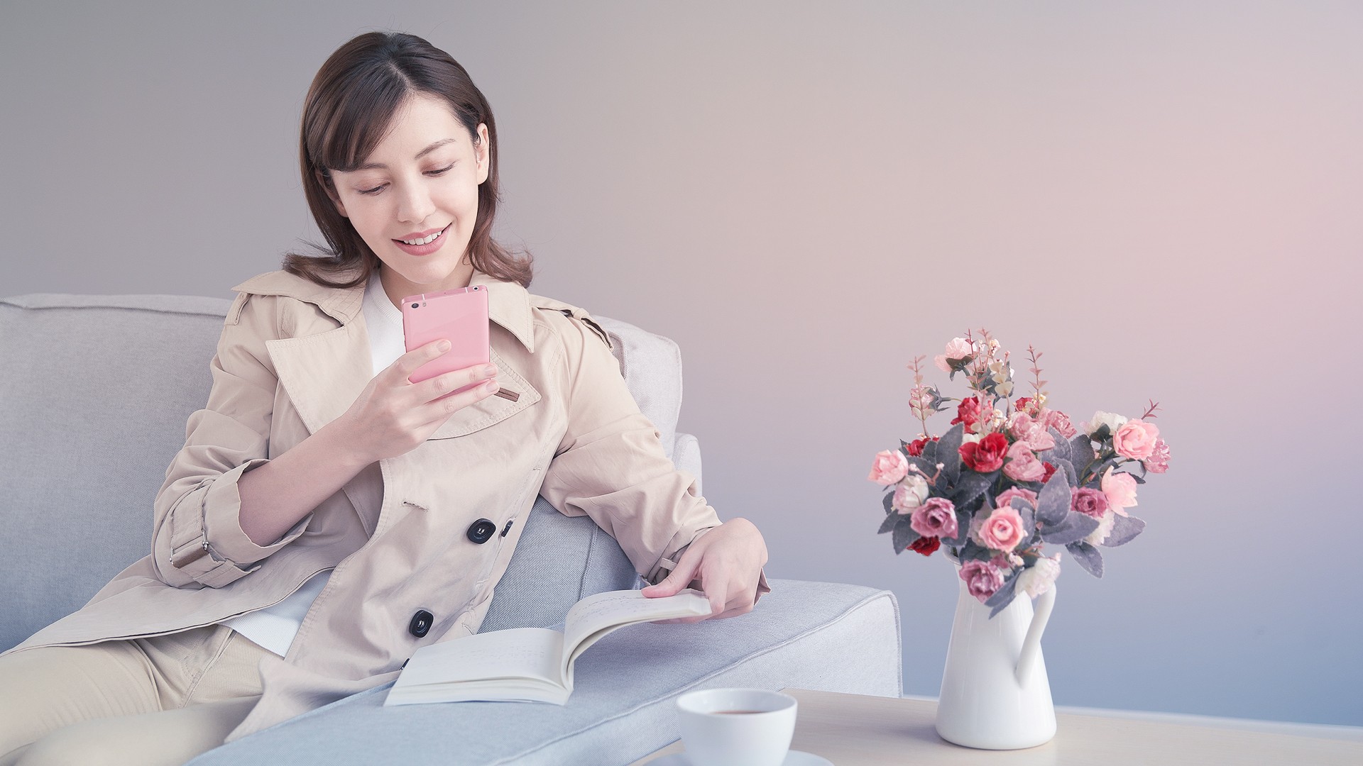 这支手机非常漂亮,这是产品图,正面是粉色的,周边的边框也是粉色的,背盖也是粉色的。专门定制的壁纸色彩都配合得非常好,粉色的手机和粉饼、唇膏和丝绸放在一起的时候非常非常的协调。