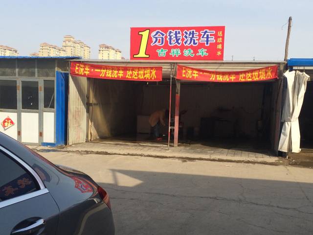 到了门口之后,从很远处就可以看到挂在门口上的条幅:E洗车·一分钱洗车 还送玻璃水。