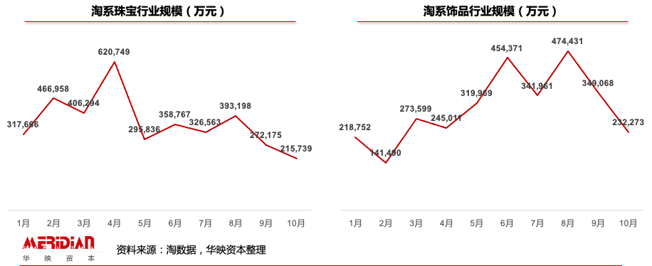 不同细分饰品品类,在电商平台上的表现有何差异?以淘宝天猫为例:珠宝配饰在上述平台有共计800多亿的市场规模,珠宝首饰和时尚配饰分别占500多亿、300多亿,市场份额约为6:4。