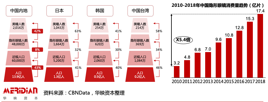 如果强调美瞳的医疗用品属性,美瞳作为视力矫正和替代框架眼镜的解决方案,在中国庞大的近视人群中,美瞳的渗透率仍有很大发展空间。