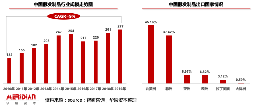 伴随国内居民生活水平提高,对美容美发、假发制品等的“颜值消费”逐渐增长,我国国内假发制品需求规模从2009年的7.19亿元增长至19年的67.25亿元。