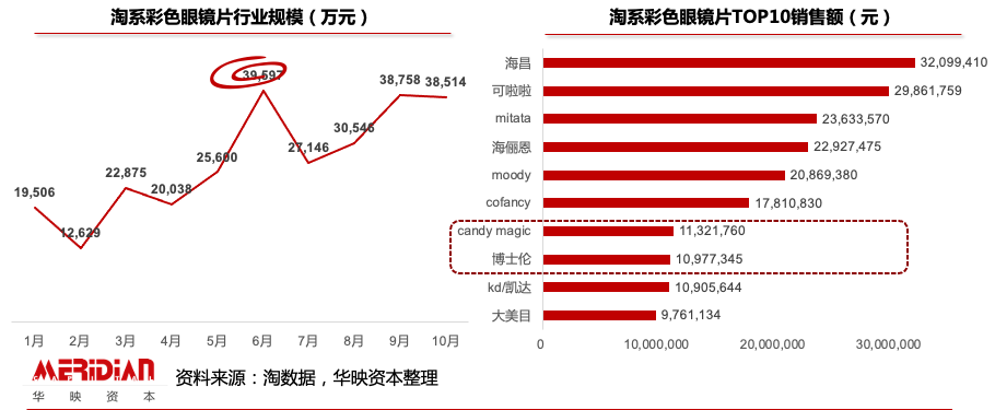 当前淘系彩色眼镜片销售额TOP10品牌中,国产品牌占据主流,仅有两个品牌candy magic和博士伦为海外品牌(分别为日系和美国品牌)。