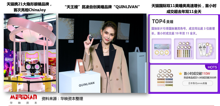 此前,天猫医药曾携手21大隐形眼镜品牌首次亮相ChinaJoy,“天王嫂”昆凌也自创美瞳品牌“QUINLIVAN”涉足商业……从coser到天王嫂,国产美瞳热度不断攀升。