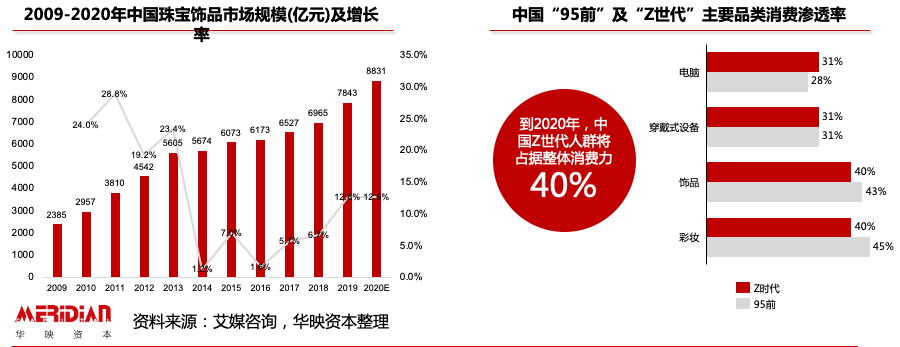 珠宝饰品方面,2019年,中国珠宝饰品市场规模为7843亿元,同比增长率为12.6%。珠宝饰品在中国仍有较大发展空间。在千亿规模的市场中,中国Z世代人群据估计占据首饰行业整体消费力的40%。