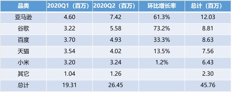 据市场研究机构Canalys报告显示,2020年上半年全球智能音箱出货量4800万台,其中带屏智能音箱出货量1363万台,占比达28.4%。其中,百度旗下的小度音箱以863万的出货量排名第三,排在亚马逊、谷歌海外巨头后面,阿里旗下的天猫精灵以756万的出货量居于第四位,小米旗下的小爱音箱以643万的出货量居于第五位。