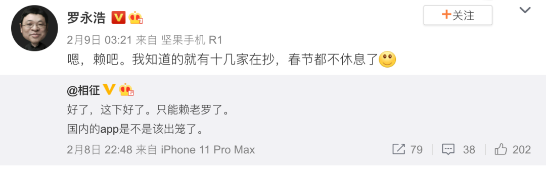 与此同时,国内大厂也早就在春节假期前后纷纷跟进。子弹短信创始人罗永浩便在社交媒体上发文称,光他知道的就有十几家春节加班“抄”。
