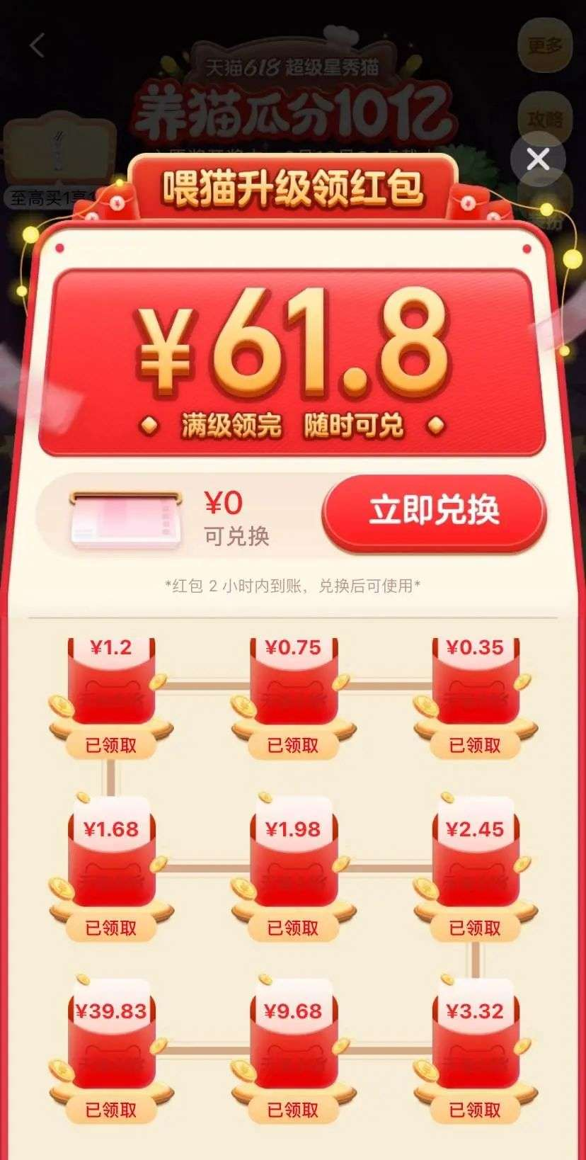 每年618电商平台都会推出小游戏让用户执行游戏任务等方式升级并获得奖励,在购物中使用。比如今年618天猫的“养猫”,挂着“瓜分10亿”的标签,还有京东的“怪兽大作战”等等。