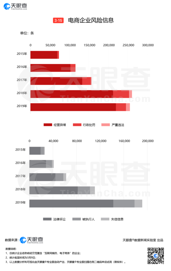 据天眼查专业版APP数据显示,电商企业的行政处罚数量也从2015年起开始翻倍增长,5年累计产生超73万次经营异常,2019年才有所回落。