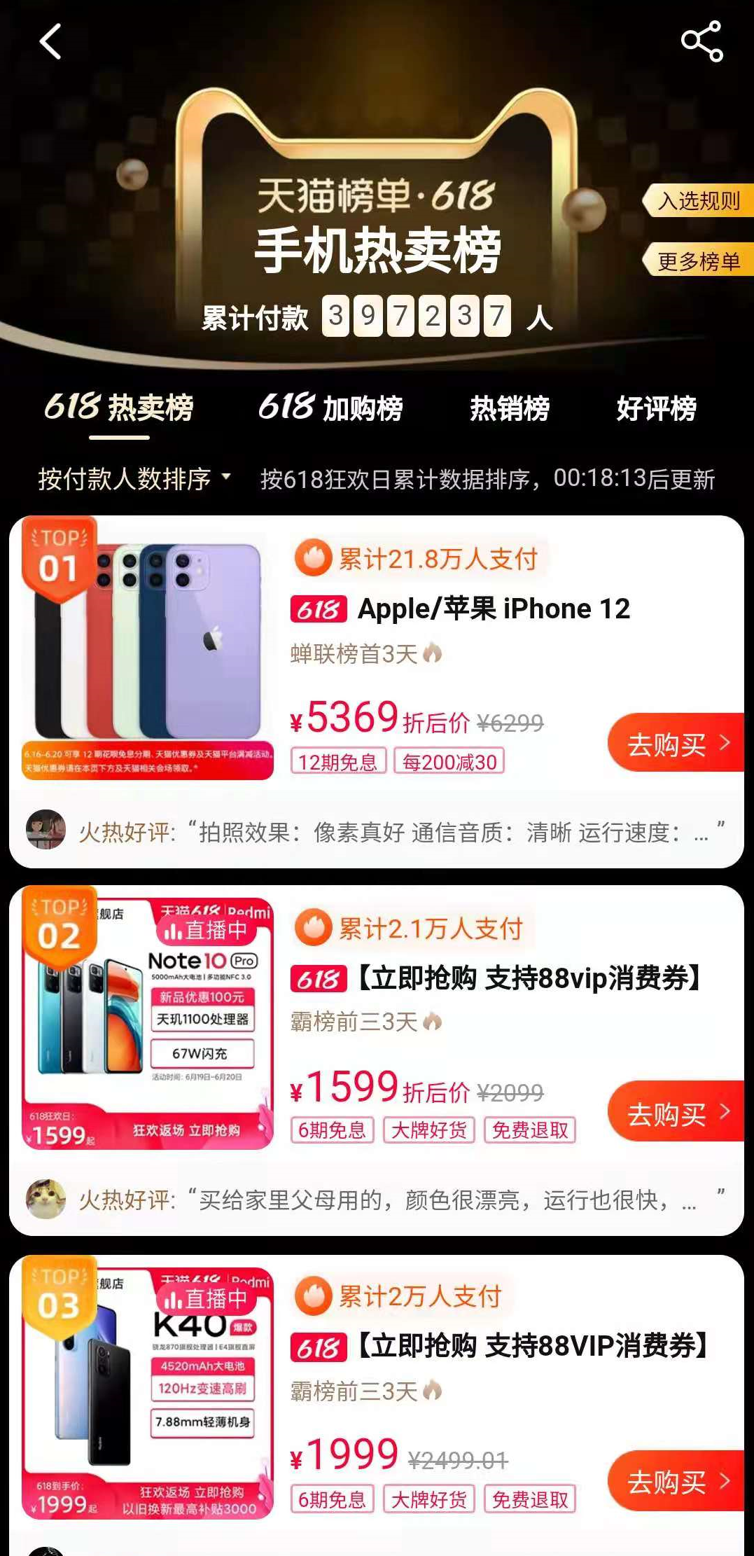 在苹果天猫官方旗舰店购买iPhone 12可以参与满200-30元的跨店满减活动,此外,88VIP用户还可以再减少400元,天猫降价后的苹果与京东也不遑多让,按618狂欢日累积数据排序的618手机热卖榜中,iphone12累积21.8万人支付,远超第二名的2.1万,稳居第一。