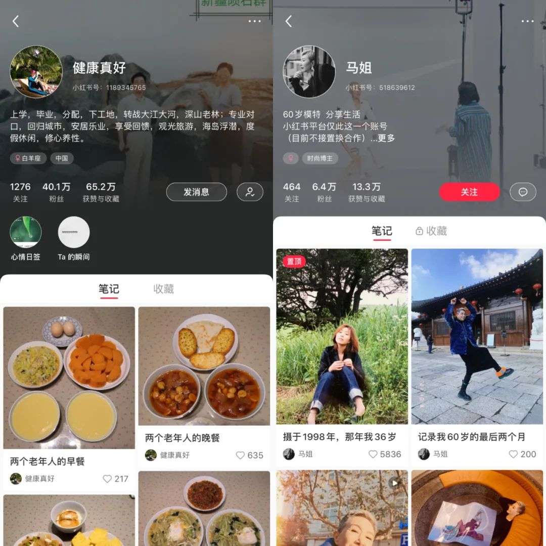 今年7月,小红书社区内容负责人河童表示,小红书男性用户占比已达到30%。小红书上也出现了越来越多的老年博主,例如一对老夫妇运营的展示一日三餐的账号@健康真好、60岁的潮流穿搭博主@马姐等等。