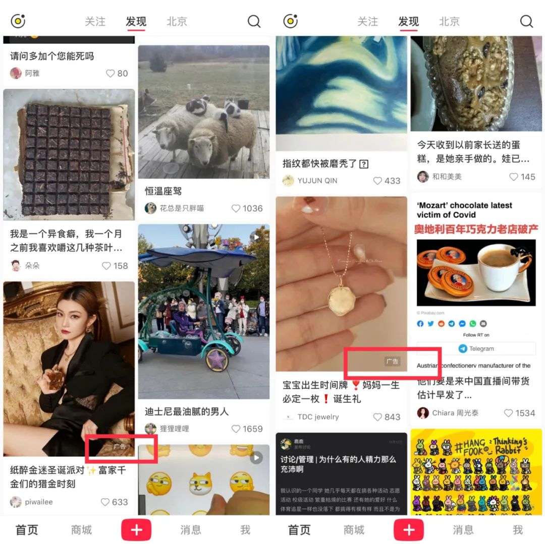 改版后,小红书发现页的第5位、15位、25位……为带标识的商业推广笔记