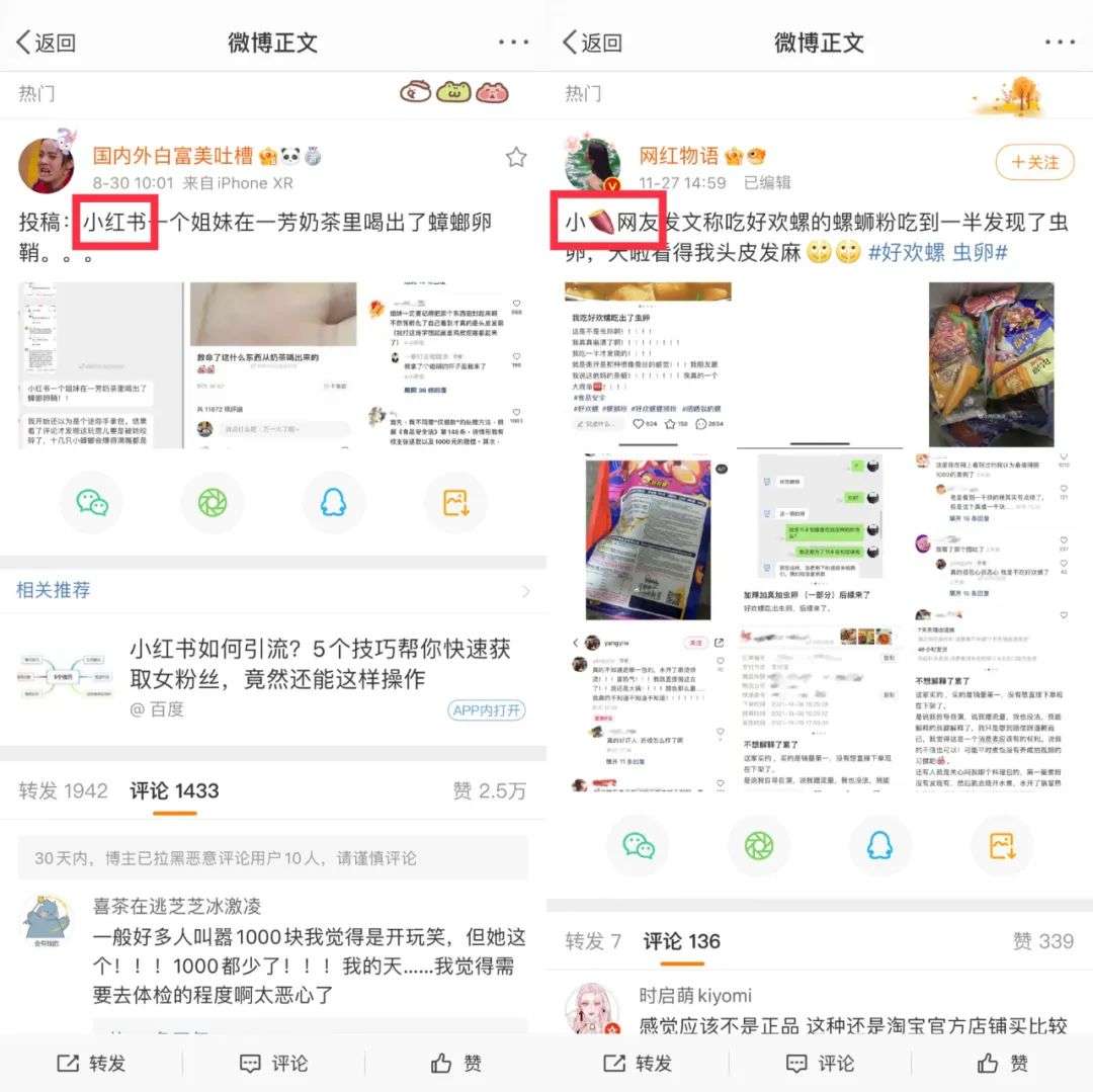 比如8月的一芳奶茶喝出蟑螂卵鞘事件、近期的好欢螺虫卵事件,都是消费者的小红书笔记先在小红书内发酵,后被营销号搬运至微博二次发酵进而上升为品牌公关事件。