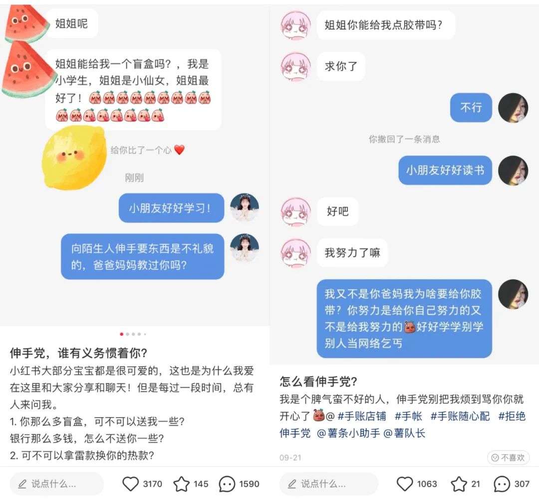 在潮玩、手工等话题下,许多年轻女性会晒出自己购买的潮玩或手工作品,但现在该类笔记下,经常会出现年幼的小学生评论“可以送我吗?”