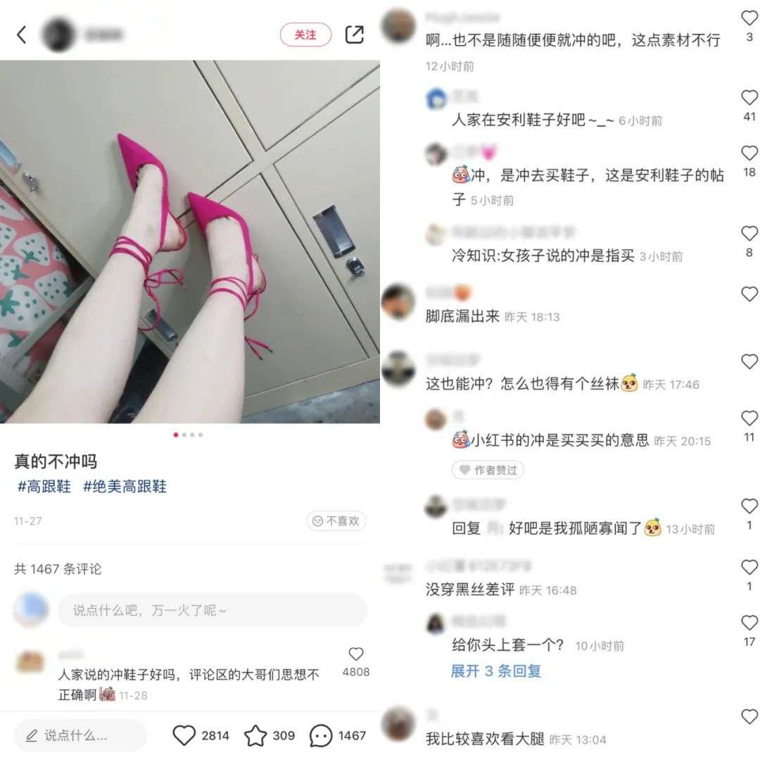 许多女性用户无奈解释道,小红书的“冲”指的是“冲去买(鞋子)”,而这些男性用户,却误认为这个“冲”字具有性暗示色彩,甚至误以为博主是色情擦边球博主。