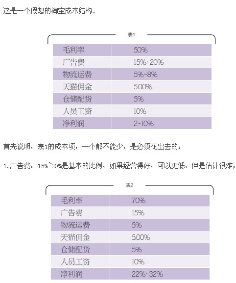 在实体商场,租金平均是20个点,20%~30%算高端购物中心了;而在淘宝,广告费基本上就耗掉你15%~20%了,加上天猫的佣金,就快20%~25%了。