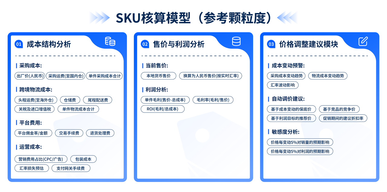 由于关税大幅上涨,直接冲击了产品的转化率和流量,以往的利润模型已无法适应新的市场环境。比如广告投放成本、电商平台使用费用、产品运输费用等常规支出项目,以及关税调整后的成本变化,测算SKU对应的销售利润。