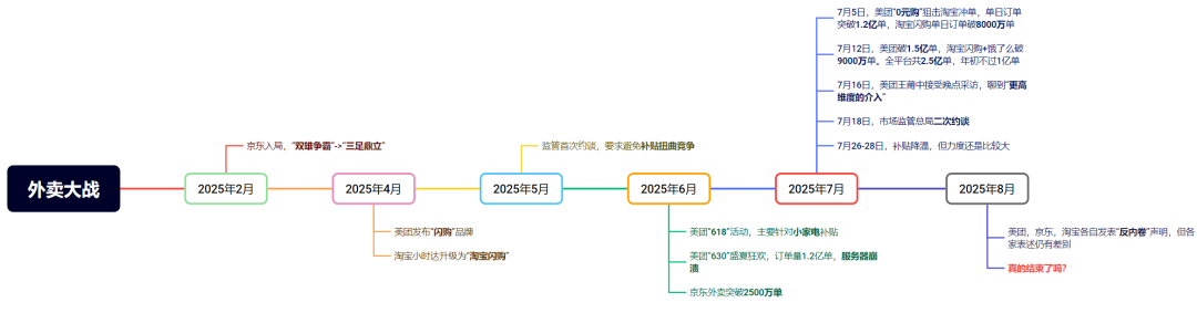 闹得全国沸沸扬扬的“外卖大战”似乎已经结束,下面是整理的整个过程的时间线。作为行业的从业者,从上个周末的情况来看,还看不到真正的结束,只能说是“降温”。本篇从个人角度来说一说三家为什么要打这样一场轰轰烈烈的“战争”。