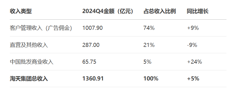 淘宝实际上是一个搜索竞价平台,他卖的是广告(可以看下面DeepSeek整理的2024Q4的收入构成)。因此,淘宝的商家需要竞价,投关键词——理论上,只要ROI为正,商家就会抬高竞价单价。对于商家而言,这其实是一个囚徒困境。虽然,近些年淘宝也开始仿照拼多多做商品流的推荐机制,但是从淘宝自身的利益来说,出价高的商品排名还是会更靠前。