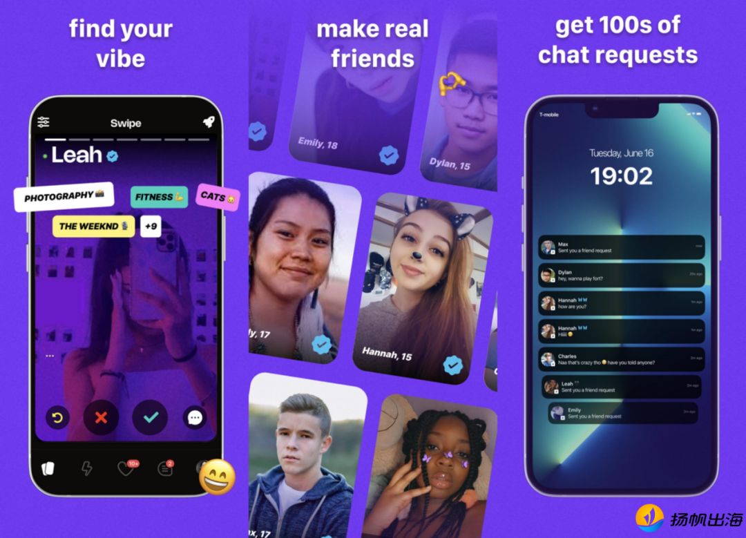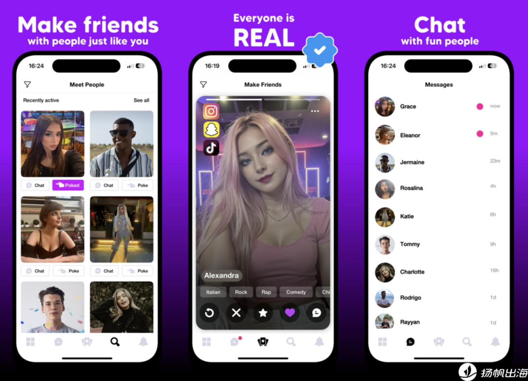 Renz上线于2023年,目前专注于欧美市场,美国用户占比较高。虽然玩法与上述两款应用有一定的同质化,即滑动用户资料后,对感兴趣的人发起好友申请,对方通过后才能开启对话,但在细节处理上还是做出了细微差异。